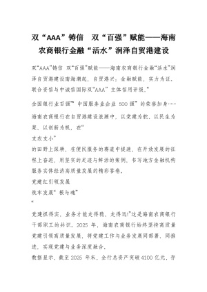双“AAA”铸信 双“百强”赋能——海南农商银行金融“活水”润泽自贸港建设