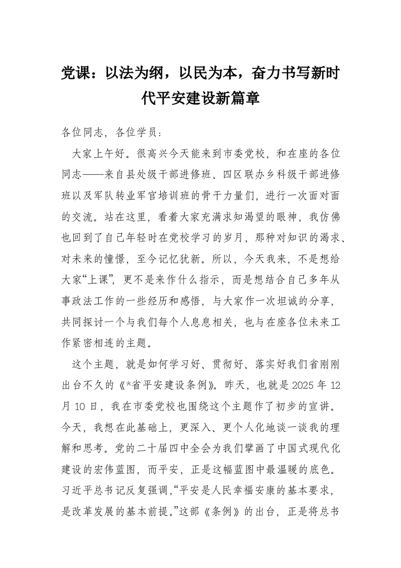党课:以法为纲,以民为本,奋力书写新时代平安建设新篇章