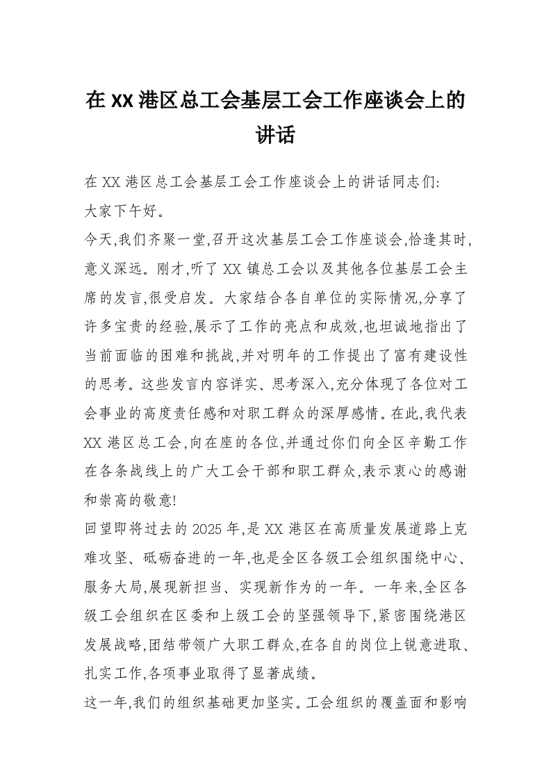 在XX港区总工会基层工会工作座谈会上的讲话