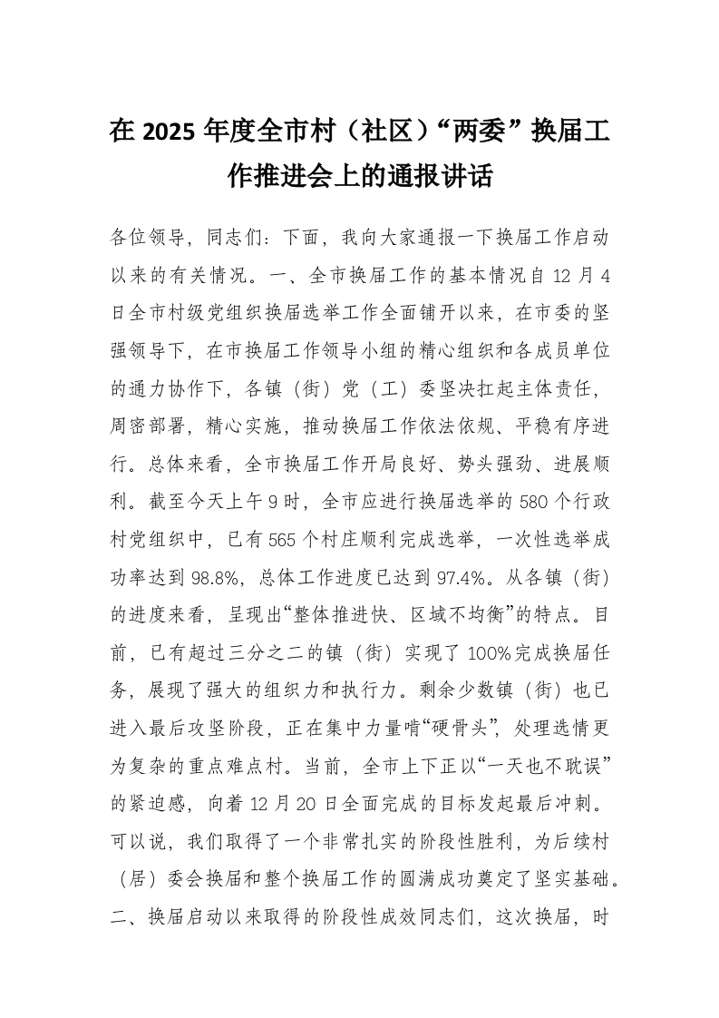 在2025年度全市村(社区)“两委”换届工作推进会上的通报讲话