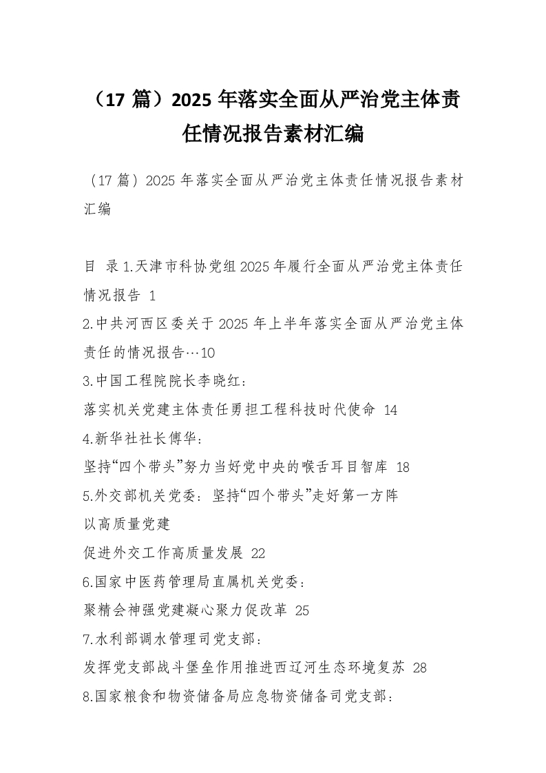 (17篇)2025年落实全面从严治党主体责任情况报告素材汇编