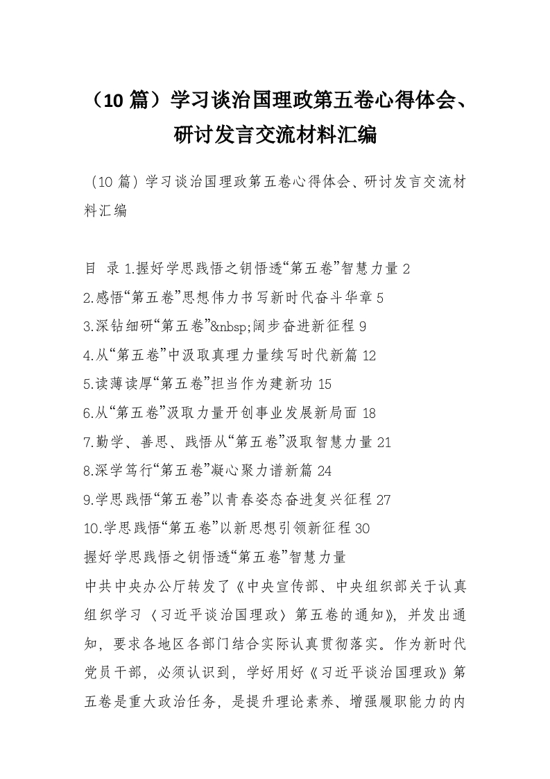 (10篇)学习谈治国理政第五卷心得体会、研讨发言交流材料汇编