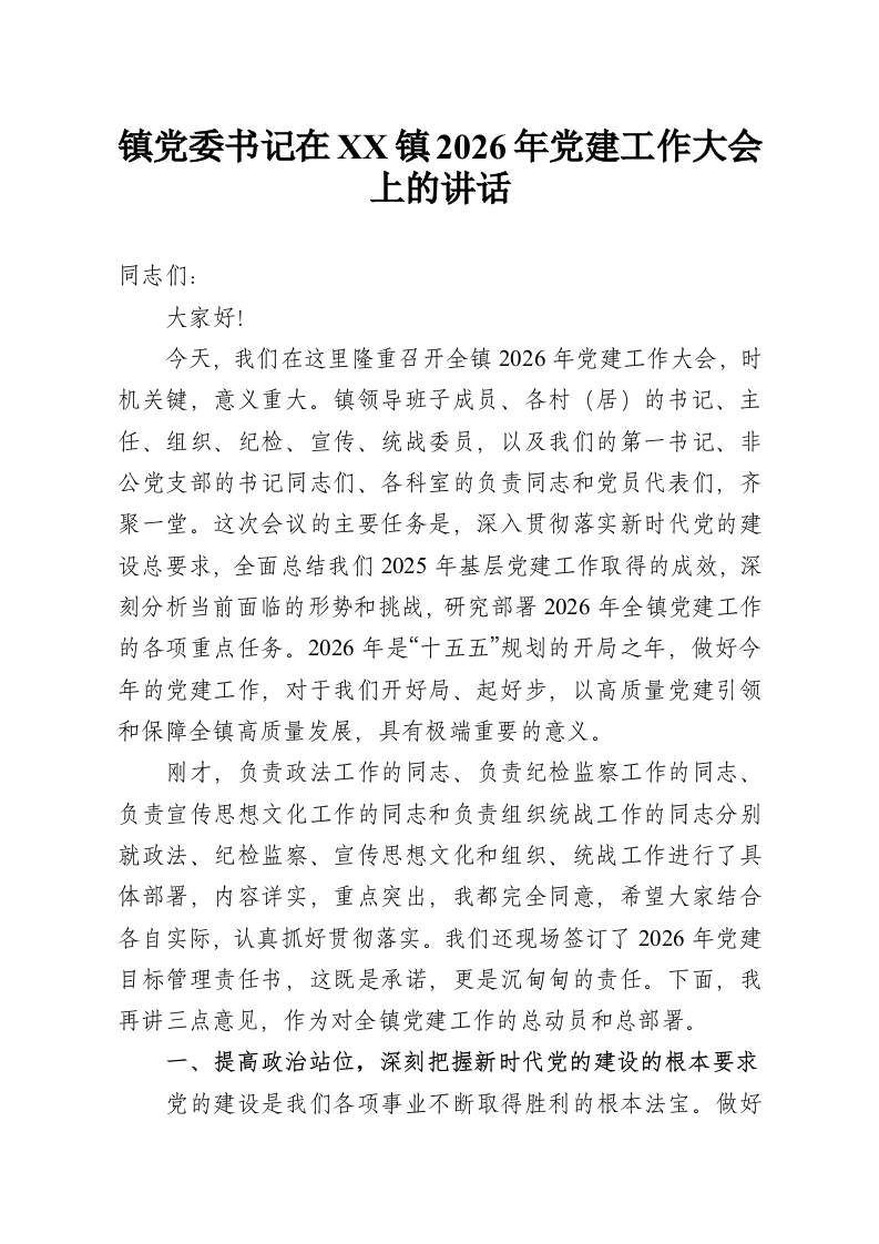 镇党委书记在XX镇2026年党建工作大会上的讲话