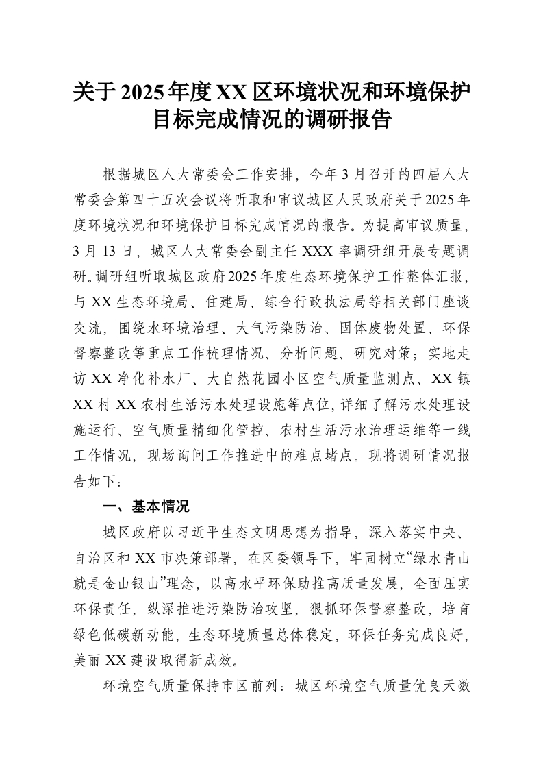 首页工作文档关于2025年度XX区环境状况和环境保护目标完成情况的调研报告
