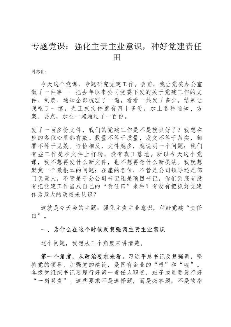 专题党课:强化主责主业意识,种好党建责任田